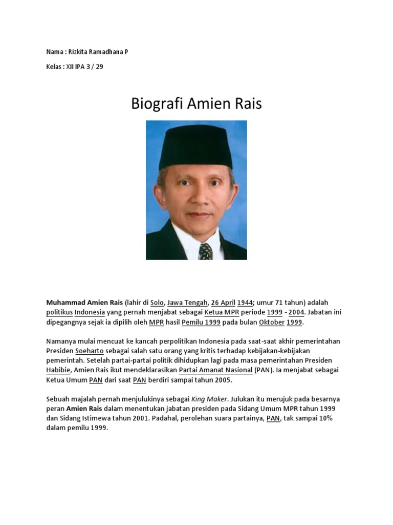 Ia pernah menjabat sebagai Ketua Umum PP Muhammadiyah pada periode 1995-1998. Usai membawa Partai Amanat Nasional PAN yang didirikannya masuk lima besar Pemilu Legislatif 1999 Amien kemudian terpilih sebagai Ketua MPR 1999-2004. Nama kecilnya Mohammad Amien.